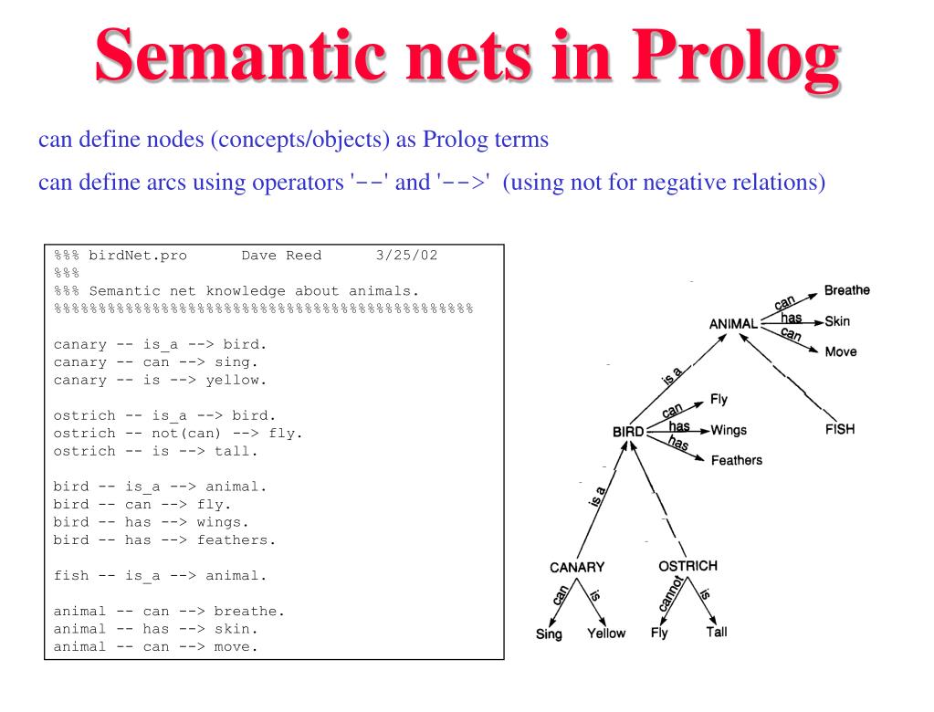 Semantic nets in Prolog can define nodes (concepts/objects) as Prolog terms can define arcs using operators '--' and '-->' (using not for negative relations) %%% birdNet.pro Dave Reed 3/25/02 %%% %%% Semantic net knowledge about animals. %%%%%%%%%%%%%%%%%%%%%%%%%%%%%%%%%%%%%%%%%%%%%%% canary -- is_a --> bird. canary -- can --> sing. canary -- is --> yellow. ostrich -- is_a --> bird. ostrich -- not(can) --> fly. ostrich -- is --> tall. bird -- is_a --> animal. bird -- can --> fly. bird -- has --> wings. bird -- has --> feathers. fish -- is_a --> animal. animal -- can --> breathe. animal -- has --> skin. animal -- can --> move.