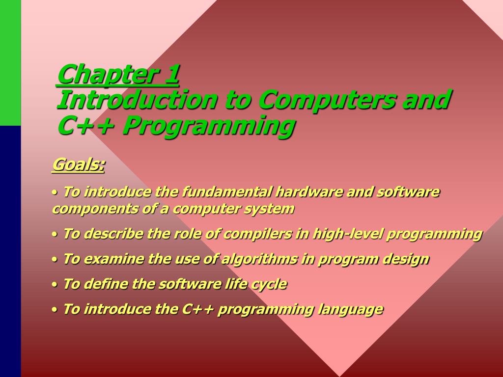 Chapter 1Introduction to Computers and C++ Programming Goals: • To introduce the fundamental hardware and software components of a computer system • To describe the role of compilers in high-level programming • To examine the use of algorithms in program design • To define the software life cycle • To introduce the C++ programming language