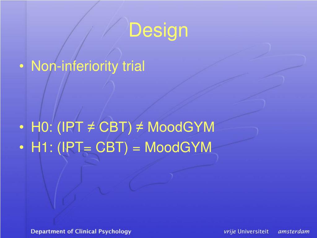Design • Non-inferiority trial • H0: (IPT ≠ CBT) ≠ MoodGYM • H1: (IPT= CBT) = MoodGYM