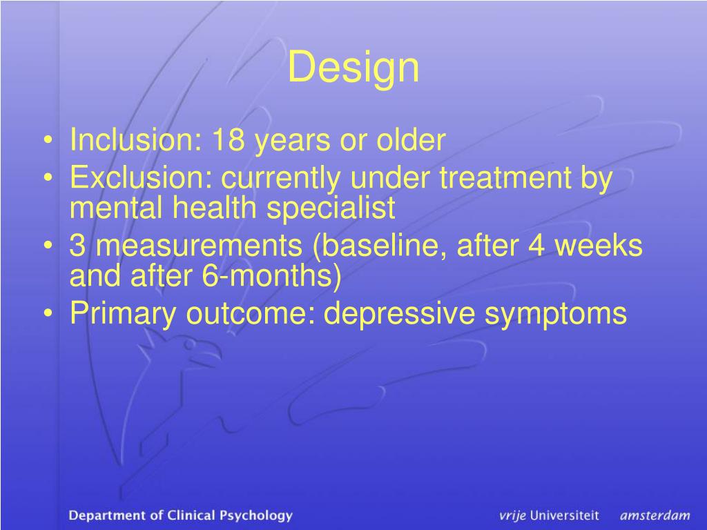 Design • Inclusion: 18 years or older • Exclusion: currently under treatment by mental health specialist • 3 measurements (baseline, after 4 weeks and after 6-months) • Primary outcome: depressive symptoms