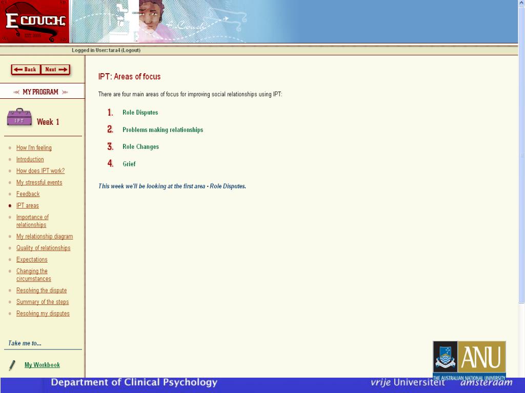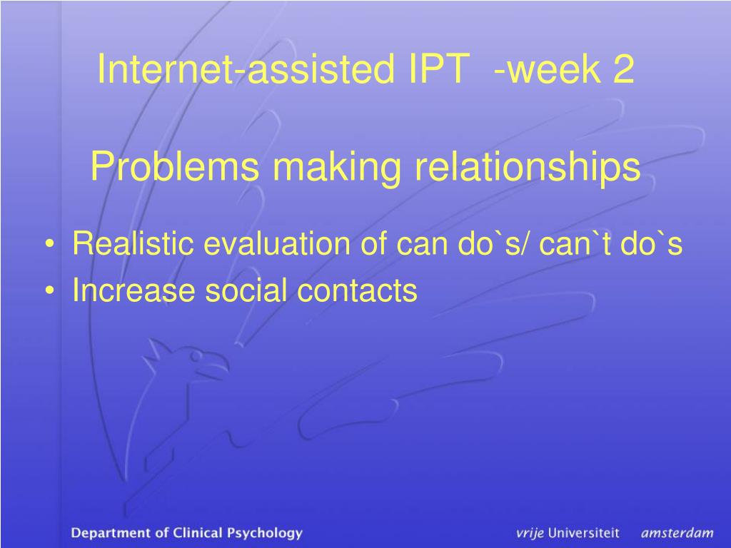 Internet-assisted IPT -week 2Problems making relationships • Realistic evaluation of can do`s/ can`t do`s • Increase social contacts
