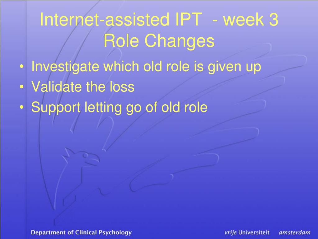 Internet-assisted IPT - week 3 Role Changes • Develop new skills for the new role • Develop new relationships and social support