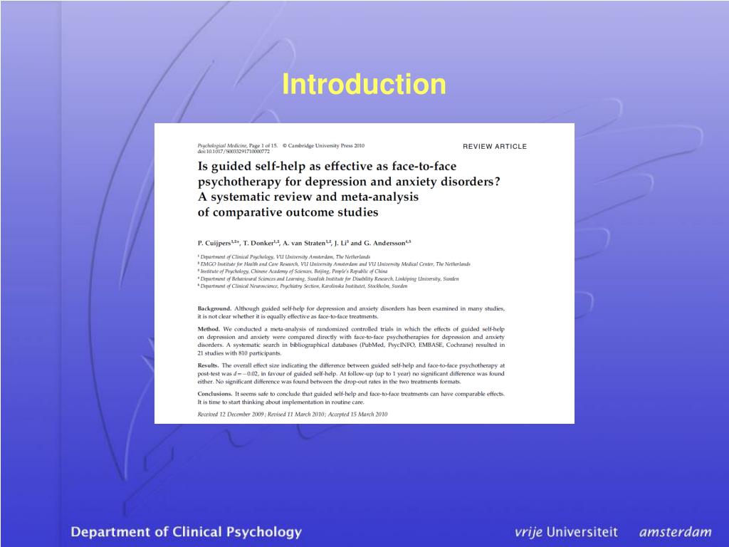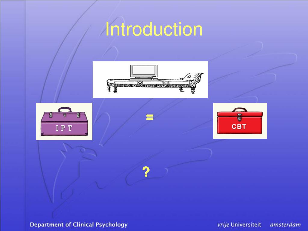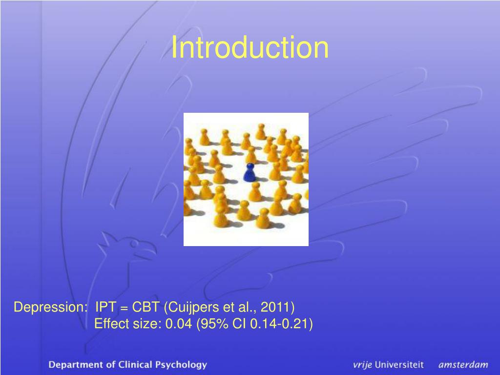 Introduction Depression: IPT = CBT (Cuijpers et al., 2011) Effect size: 0.04 (95% CI 0.14-0.21)