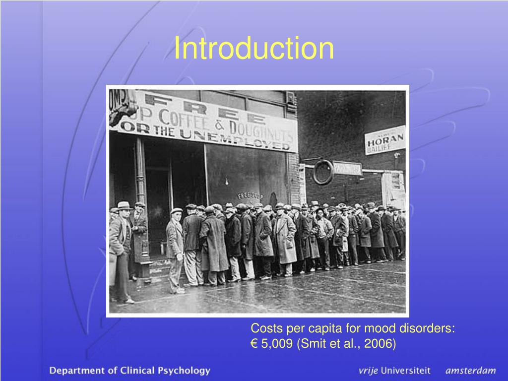 Introduction Costs per capita for mood disorders: € 5,009 (Smit et al., 2006)