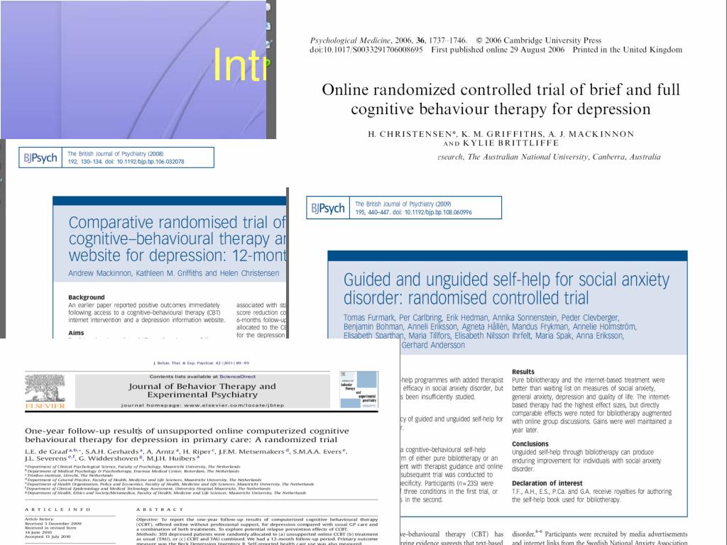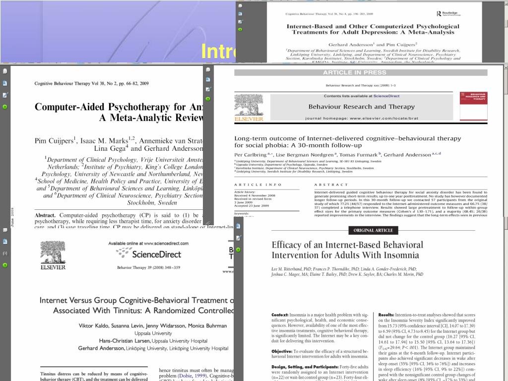 Introduction E-CBT = effective (e.g. Carlbring et al., 2009; Christensen et al., 2004;Kaldo et al., 2008; Ruwaard et al., 2009; Spek et al., 2008; Warmerdam et al., 2008)