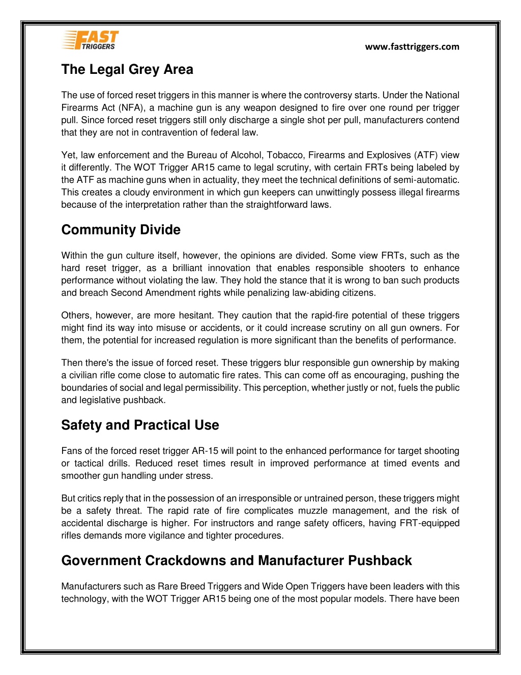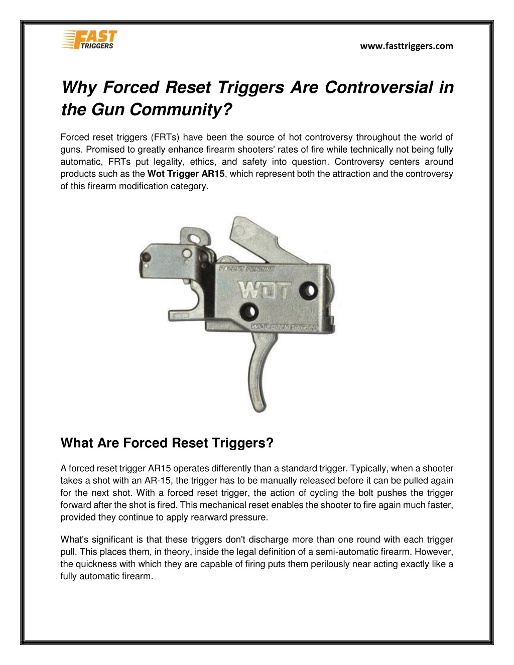 www.fasttriggers.com Why Forced Reset Triggers Are Controversial in the Gun Community? Forced reset triggers (FRTs) have been the source of hot controversy throughout the world of guns. Promised to greatly enhance firearm shooters' rates of fire while technically not being fully automatic, FRTs put legality, ethics, and safety into question. Controversy centers around products such as the Wot Trigger AR15, which represent both the attraction and the controversy of this firearm modification category. What Are Forced Reset Triggers? A forced reset trigger AR15 operates differently than a standard trigger. Typically, when a shooter takes a shot with an AR-15, the trigger has to be manually released before it can be pulled again for the next shot. With a forced reset trigger, the action of cycling the bolt pushes the trigger forward after the shot is fired. This mechanical reset enables the shooter to fire again much faster, provided they continue to apply rearward pressure. What's significant is that these triggers don't discharge more than one round with each trigger pull. This places them, in theory, inside the legal definition of a semi-automatic firearm. However, the quickness with which they are capable of firing puts them perilously near acting exactly like a fully automatic firearm.