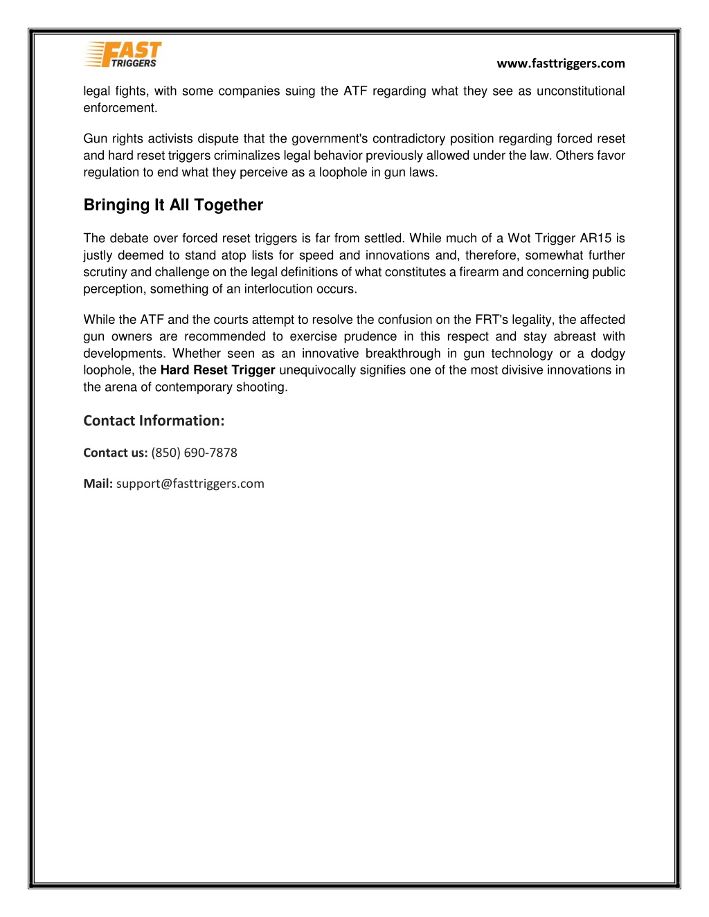 www.fasttriggers.com legal fights, with some companies suing the ATF regarding what they see as unconstitutional enforcement. Gun rights activists dispute that the government's contradictory position regarding forced reset and hard reset triggers criminalizes legal behavior previously allowed under the law. Others favor regulation to end what they perceive as a loophole in gun laws. Bringing It All Together The debate over forced reset triggers is far from settled. While much of a Wot Trigger AR15 is justly deemed to stand atop lists for speed and innovations and, therefore, somewhat further scrutiny and challenge on the legal definitions of what constitutes a firearm and concerning public perception, something of an interlocution occurs. While the ATF and the courts attempt to resolve the confusion on the FRT's legality, the affected gun owners are recommended to exercise prudence in this respect and stay abreast with developments. Whether seen as an innovative breakthrough in gun technology or a dodgy loophole, the Hard Reset Trigger unequivocally signifies one of the most divisive innovations in the arena of contemporary shooting. Contact Information: Contact us: (850) 690-7878 Mail: support@fasttriggers.com