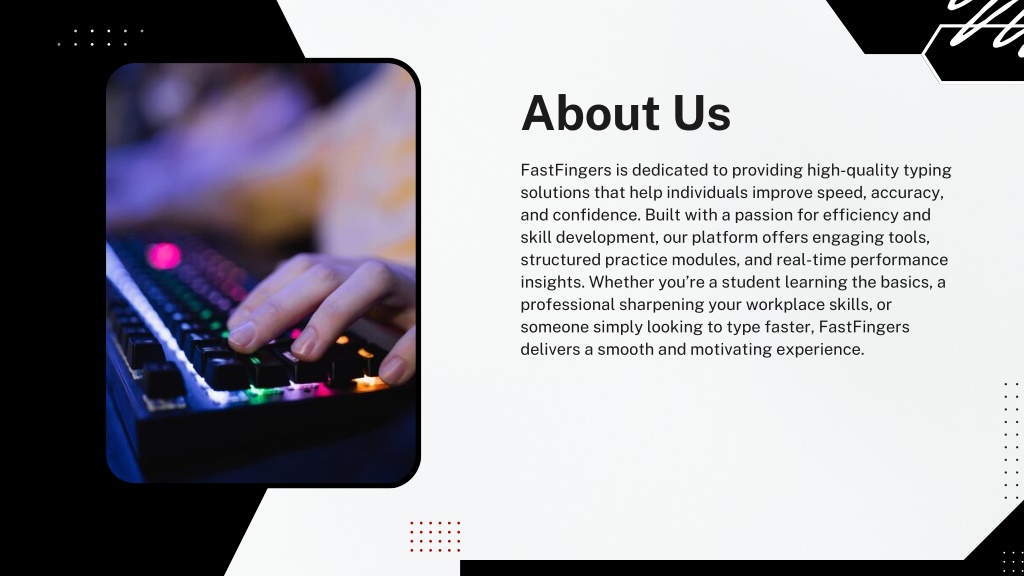 About Us FastFingers is dedicated to providing high-quality typing solutions that help individuals improve speed, accuracy, and confidence. Built with a passion for efficiency and skill development, our platform offers engaging tools, structured practice modules, and real-time performance insights. Whether you’re a student learning the basics, a professional sharpening your workplace skills, or someone simply looking to type faster, FastFingers delivers a smooth and motivating experience.