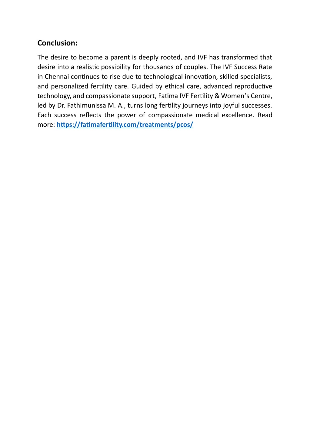 Conclusion: The desire to become a parent is deeply rooted, and IVF has transformed that desire into a realistic possibility for thousands of couples. The IVF Success Rate in Chennai continues to rise due to technological innovation, skilled specialists, and personalized fertility care. Guided by ethical care, advanced reproductive technology, and compassionate support, Fatima IVF Fertility & Women’s Centre, led by Dr. Fathimunissa M. A., turns long fertility journeys into joyful successes. Each success reflects the power of compassionate medical excellence. Read more: https://fatimafertility.com/treatments/pcos/