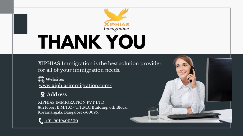 THANK YOU XIPHIAS Immigration is the best solution provider for all of your immigration needs. Websites www.xiphiasimmigration.com/ Address XIPHIAS IMMIGRATION PVT LTD 8th Floor, B.M.T.C / T.T.M.C Building, 6th Block, Koramangala, Bangalore-560095. +91-9019400500