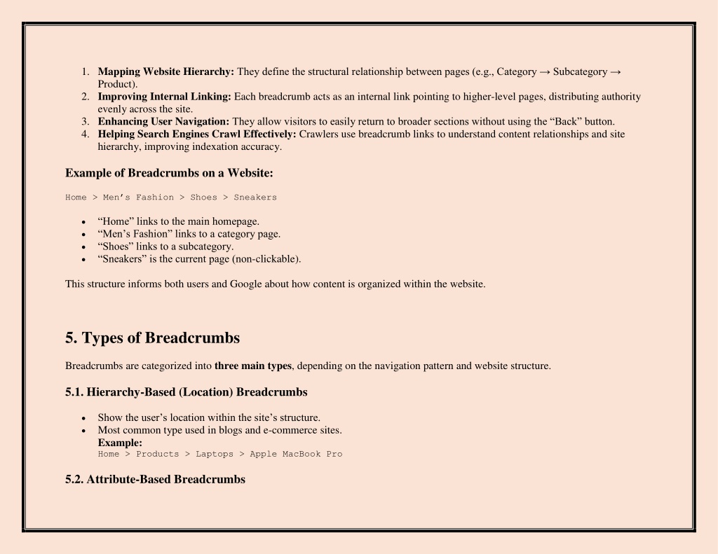 1.Mapping Website Hierarchy:They define the structural relationship between pages (e.g., Category → Subcategory → Product). 2.Improving Internal Linking: Each breadcrumb acts as an internal link pointing to higher-level pages, distributing authority evenly across the site. 3.Enhancing User Navigation:They allow visitors to easily return to broader sections without using the “Back” button. 4.Helping Search Engines Crawl Effectively: Crawlers use breadcrumb links to understand content relationships and site hierarchy, improving indexation accuracy. Example of Breadcrumbs on a Website: Home > Men’s Fashion > Shoes > Sneakers “Home” links to the main homepage. “Men’s Fashion” links to a category page. “Shoes” links to a subcategory. “Sneakers” is the current page (non-clickable). This structure informs both users and Google about how content is organized within the website. 5. Types of Breadcrumbs Breadcrumbs are categorized into three main types, depending on the navigation pattern and website structure. 5.1. Hierarchy-Based (Location) Breadcrumbs Show the user’s location within the site’s structure. Most common type used in blogs and e-commerce sites. Example: Home > Products > Laptops > Apple MacBook Pro 5.2. Attribute-Based Breadcrumbs