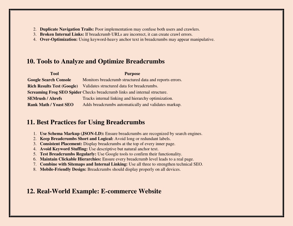 2.Duplicate Navigation Trails: Poor implementation may confuse both users and crawlers. 3.Broken Internal Links: If breadcrumb URLs are incorrect, it can create crawl errors. 4.Over-Optimization: Using keyword-heavy anchor text in breadcrumbs may appear manipulative. 10. Tools to Analyze and Optimize Breadcrumbs Tool Purpose Google Search Console Rich Results Test (Google) Validates structured data for breadcrumbs. Screaming Frog SEO Spider Checks breadcrumb links and internal structure. SEMrush / Ahrefs Tracks internal linking and hierarchy optimization. Rank Math / Yoast SEO Adds breadcrumbs automatically and validates markup. Monitors breadcrumb structured data and reports errors. 11. Best Practices for Using Breadcrumbs 1.Use Schema Markup (JSON-LD): Ensure breadcrumbs are recognized by search engines. 2.Keep Breadcrumbs Short and Logical: Avoid long or redundant labels. 3.Consistent Placement: Display breadcrumbs at the top of every inner page. 4.Avoid Keyword Stuffing: Use descriptive but natural anchor text. 5.Test Breadcrumbs Regularly: Use Google tools to confirm their functionality. 6.Maintain Clickable Hierarchies: Ensure every breadcrumb level leads to a real page. 7.Combine with Sitemaps and Internal Linking: Use all three to strengthen technical SEO. 8.Mobile-Friendly Design: Breadcrumbs should display properly on all devices. 12. Real-World Example: E-commerce Website