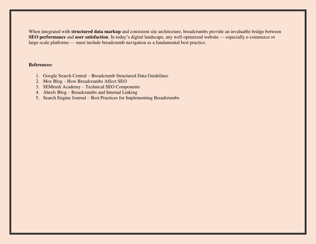 When integrated with structured data markup and consistent site architecture, breadcrumbs provide an invaluable bridge between SEO performance and user satisfaction. In today’s digital landscape, any well-optimized website — especially e-commerce or large-scale platforms — must include breadcrumb navigation as a fundamental best practice. References: 1.Google Search Central – Breadcrumb Structured Data Guidelines 2.Moz Blog – How Breadcrumbs Affect SEO 3.SEMrush Academy – Technical SEO Components 4.Ahrefs Blog – Breadcrumbs and Internal Linking 5.Search Engine Journal – Best Practices for Implementing Breadcrumbs