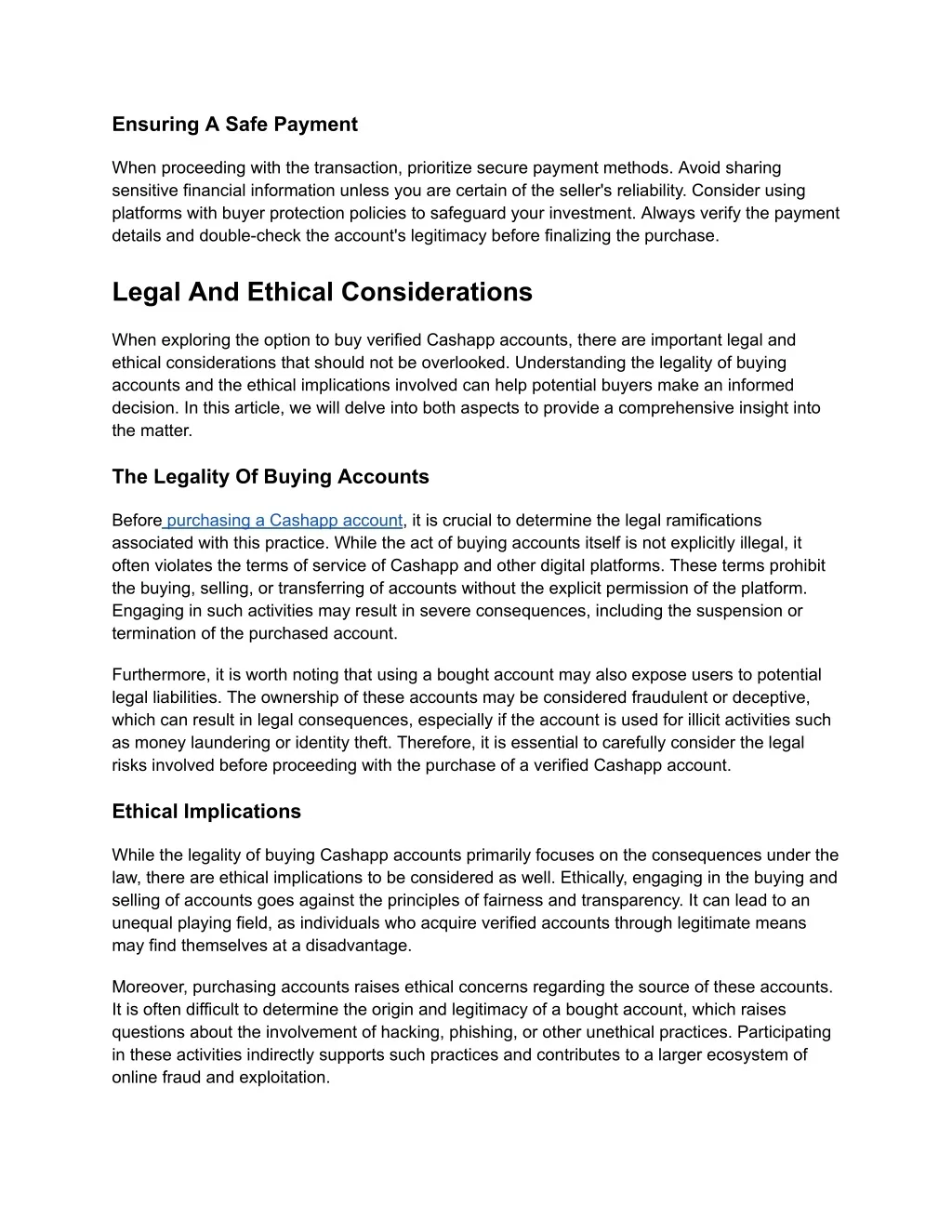 Ensuring A Safe Payment When proceeding with the transaction, prioritize secure payment methods. Avoid sharing sensitive financial information unless you are certain of the seller's reliability. Consider using platforms with buyer protection policies to safeguard your investment. Always verify the payment details and double-check the account's legitimacy before finalizing the purchase. Legal And Ethical Considerations When exploring the option to buy verified Cashapp accounts, there are important legal and ethical considerations that should not be overlooked. Understanding the legality of buying accounts and the ethical implications involved can help potential buyers make an informed decision. In this article, we will delve into both aspects to provide a comprehensive insight into the matter. The Legality Of Buying Accounts Before purchasing a Cashapp account, it is crucial to determine the legal ramifications associated with this practice. While the act of buying accounts itself is not explicitly illegal, it often violates the terms of service of Cashapp and other digital platforms. These terms prohibit the buying, selling, or transferring of accounts without the explicit permission of the platform. Engaging in such activities may result in severe consequences, including the suspension or termination of the purchased account. Furthermore, it is worth noting that using a bought account may also expose users to potential legal liabilities. The ownership of these accounts may be considered fraudulent or deceptive, which can result in legal consequences, especially if the account is used for illicit activities such as money laundering or identity theft. Therefore, it is essential to carefully consider the legal risks involved before proceeding with the purchase of a verified Cashapp account. Ethical Implications While the legality of buying Cashapp accounts primarily focuses on the consequences under the law, there are ethical implications to be considered as well. Ethically, engaging in the buying and selling of accounts goes against the principles of fairness and transparency. It can lead to an unequal playing field, as individuals who acquire verified accounts through legitimate means may find themselves at a disadvantage. Moreover, purchasing accounts raises ethical concerns regarding the source of these accounts. It is often difficult to determine the origin and legitimacy of a bought account, which raises questions about the involvement of hacking, phishing, or other unethical practices. Participating in these activities indirectly supports such practices and contributes to a larger ecosystem of online fraud and exploitation.