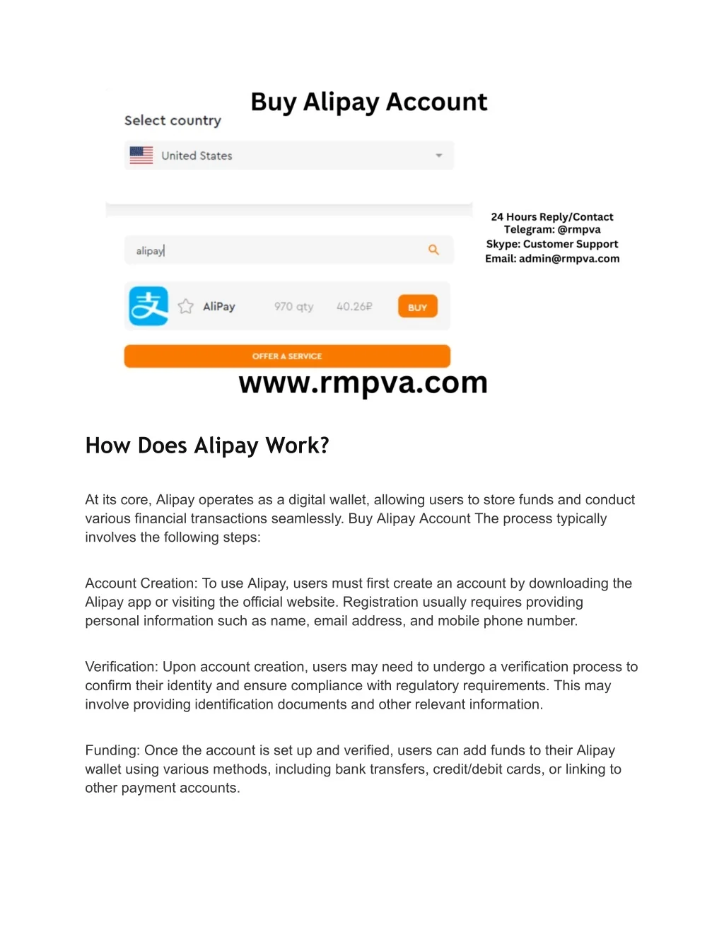 Buy Alipay Account Buy Alipay Account An Alipay account is a user profile on the mobile and online payment platform Alipay, operated by Ant Group, an affiliate of the Chinese multinational conglomerate Alibaba Group. Alipay is one of the leading digital payment platforms in China and serves What is in my Alipay account ➤ Full Documents Validated. ➤ All verifications completed. ➤ Instant Delivery. ➤ Cheap Price. ➤ Buy Alipay Account. If you have more questions then contact us we will help you solve your all questions answer. If you would like further information, please contact us. Telegram: @rmpva Skype: Customer Support Email: admin@rmpva.com Buy Alipay Accounts Introduction: In the digital age, online transactions have become the norm for businesses and individuals alike. Buy Alipay Account With the rise of e-commerce and global trade, having a secure and reliable online payment system is crucial. Alipay, a leading digital payment platform, has gained immense popularity for its convenience and security features. However, acquiring a verified Alipay account can be challenging for some. In this article, we’ll explore the option to buy Alipay accounts and discuss the importance of doing so securely.