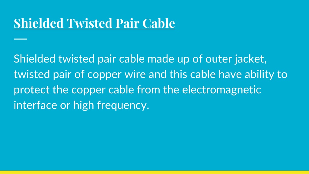 Shielded Twisted Pair Cable Shielded twisted pair cable made up of outer jacket, twisted pair of copper wire and this cable have ability to protect the copper cable from the electromagnetic interface or high frequency.