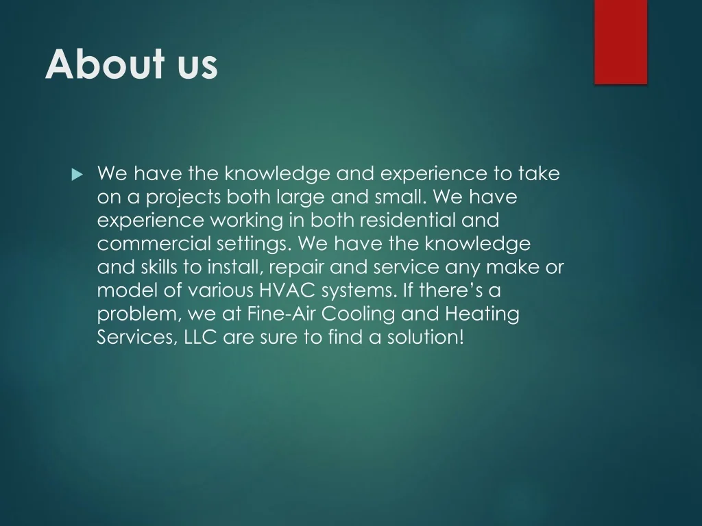 About us • We have the knowledge and experience to take on a projects both large and small. We have experience working in both residential and commercial settings. We have the knowledge and skills to install, repair and service any make or model of various HVAC systems. If there’s a problem, we at Fine-Air Cooling and Heating Services, LLC are sure to find a solution!
