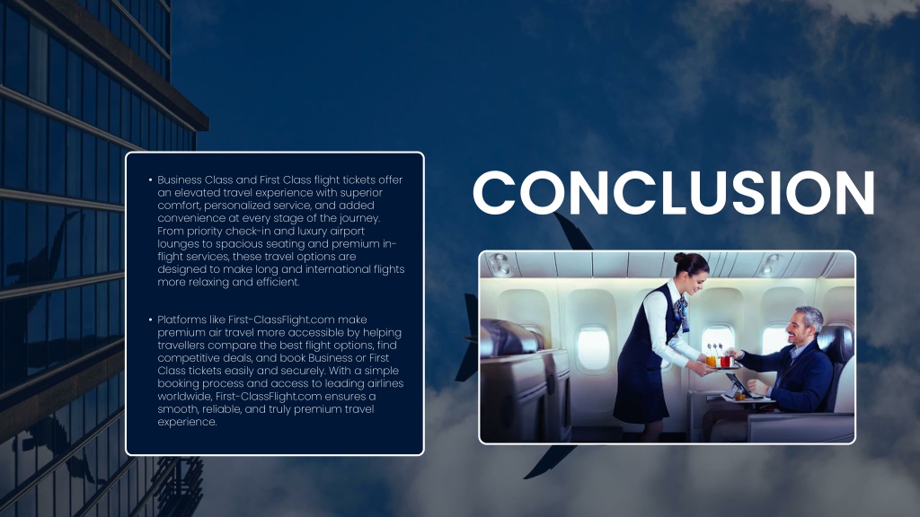 CONCLUSION • Business Class and First Class flight tickets offer an elevated travel experience with superior comfort, personalized service, and added convenience at every stage of the journey. From priority check-in and luxury airport lounges to spacious seating and premium in-flight services, these travel options are designed to make long and international flights more relaxing and efficient. • Platforms like First-ClassFlight.com make premium air travel more accessible by helping travellers compare the best flight options, find competitive deals, and book Business or First Class tickets easily and securely. With a simple booking process and access to leading airlines worldwide, First-ClassFlight.com ensures a smooth, reliable, and truly premium travel experience.