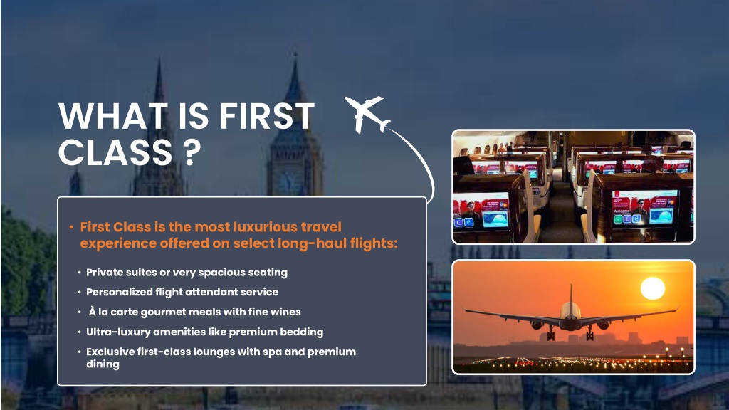 WHAT IS FIRST CLASS ? • First Class is the most luxurious travel experience offered on select long-haul flights: • Private suites or very spacious seating • Personalized flight attendant service • À la carte gourmet meals with fine wines • Ultra-luxury amenities like premium bedding • Exclusive first-class lounges with spa and premium dining