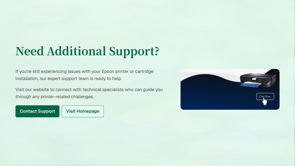 Need Additional Support? If you're still experiencing issues with your Epson printer or cartridge installation, our expert support team is ready to help. Visit our website to connect with technical specialists who can guide you through any printer-related challenges. Contact Support Visit Homepage