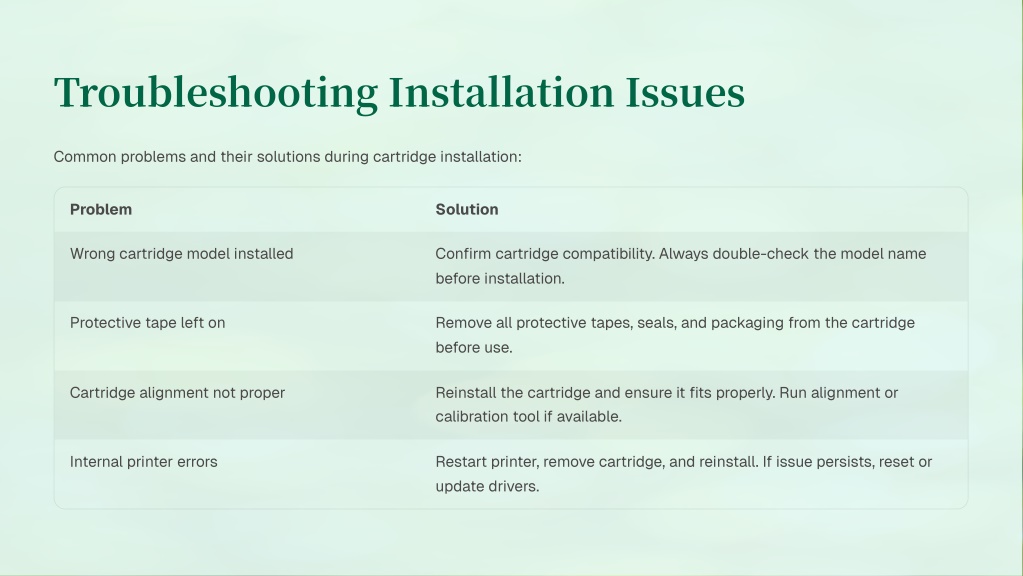 Troubleshooting Installation Issues Common problems and their solutions during cartridge installation: Problem Solution Wrong cartridge model installed Confirm cartridge compatibility. Always double-check the model name before installation. Protective tape left on Remove all protective tapes, seals, and packaging from the cartridge before use. Cartridge alignment not proper Reinstall the cartridge and ensure it fits properly. Run alignment or calibration tool if available. Internal printer errors Restart printer, remove cartridge, and reinstall. If issue persists, reset or update drivers.