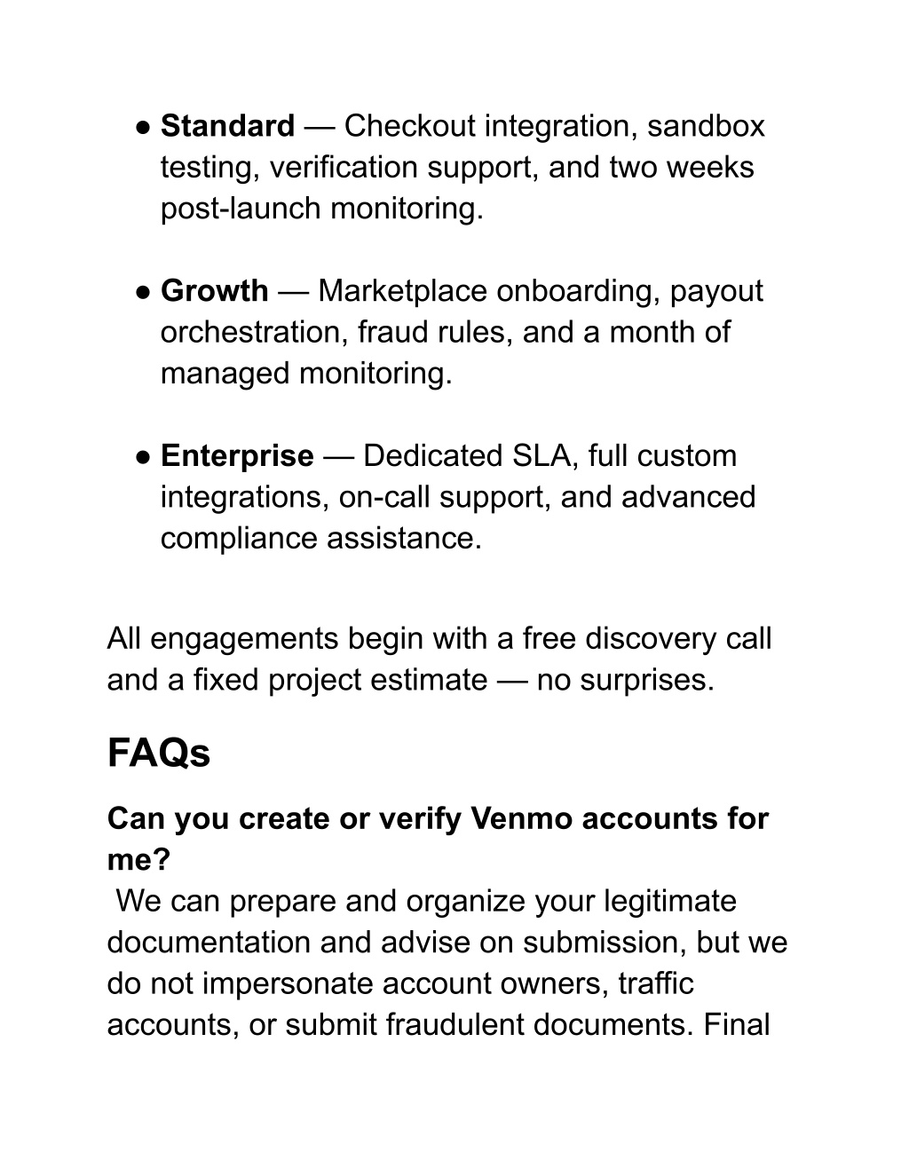 ● Standard — Checkout integration, sandbox testing, verification support, and two weeks post-launch monitoring. ● Growth — Marketplace onboarding, payout orchestration, fraud rules, and a month of managed monitoring. ● Enterprise — Dedicated SLA, full custom integrations, on-call support, and advanced compliance assistance. All engagements begin with a free discovery call and a fixed project estimate — no surprises. FAQs Can you create or verify Venmo accounts for me? We can prepare and organize your legitimate documentation and advise on submission, but we do not impersonate account owners, traffic accounts, or submit fraudulent documents. Final