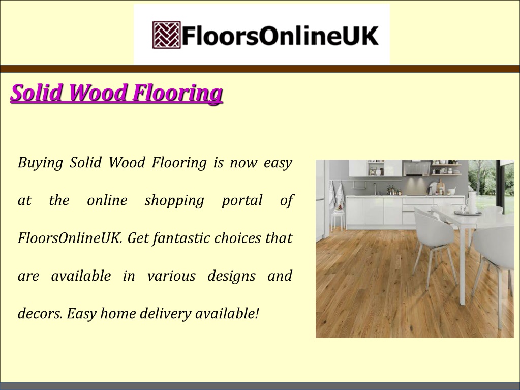 Solid Wood Flooring Buying Solid Wood Flooring is now easy at the online shopping portal of FloorsOnlineUK. Get fantastic choices that are available in various designs and decors. Easy home delivery available!
