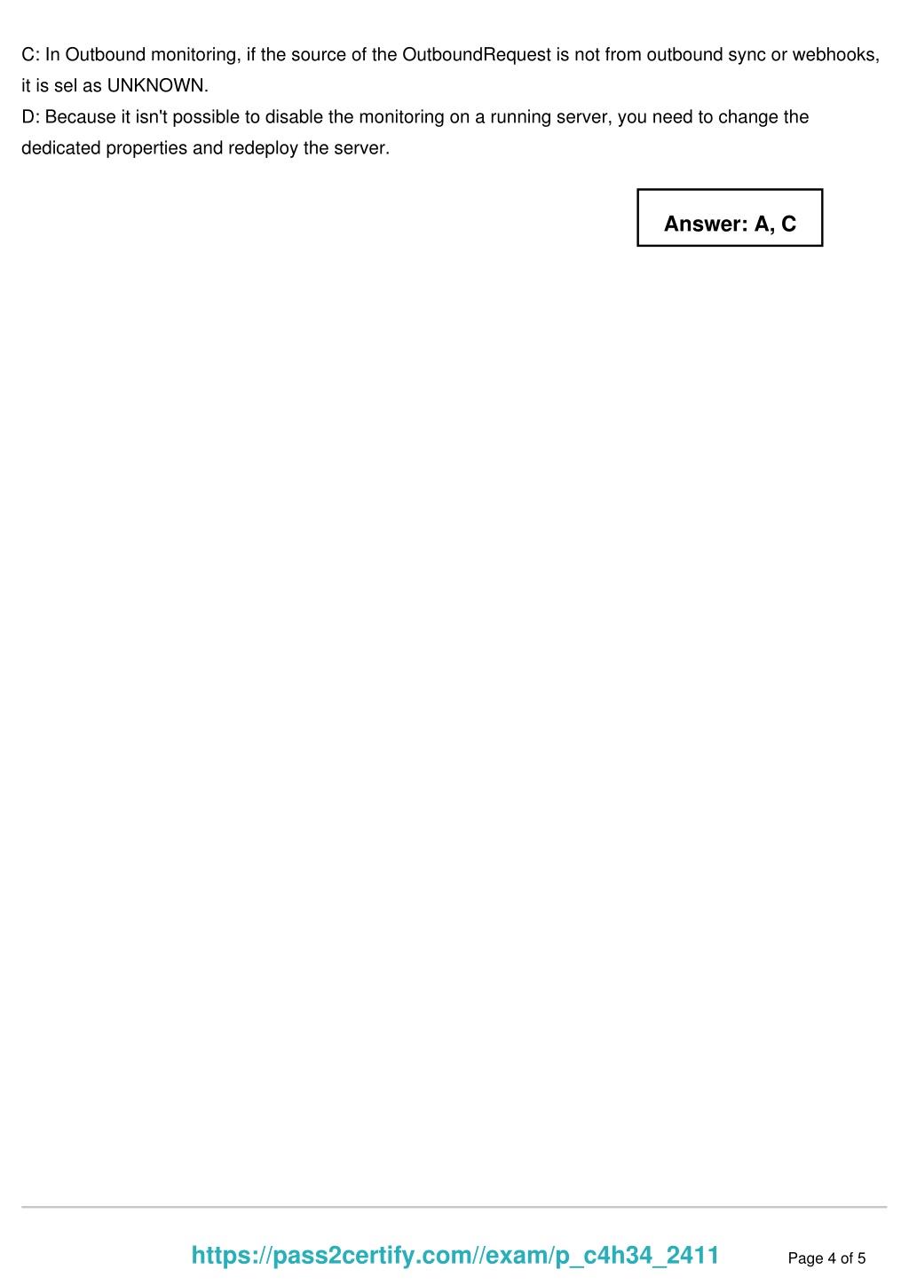 C: In Outbound monitoring, if the source of the OutboundRequest is not from outbound sync or webhooks, it is sel as UNKNOWN. D: Because it isn't possible to disable the monitoring on a running server, you need to change the dedicated properties and redeploy the server. Answer: A, C https://pass2certify.com//exam/p_c4h34_2411 Page 4 of 5