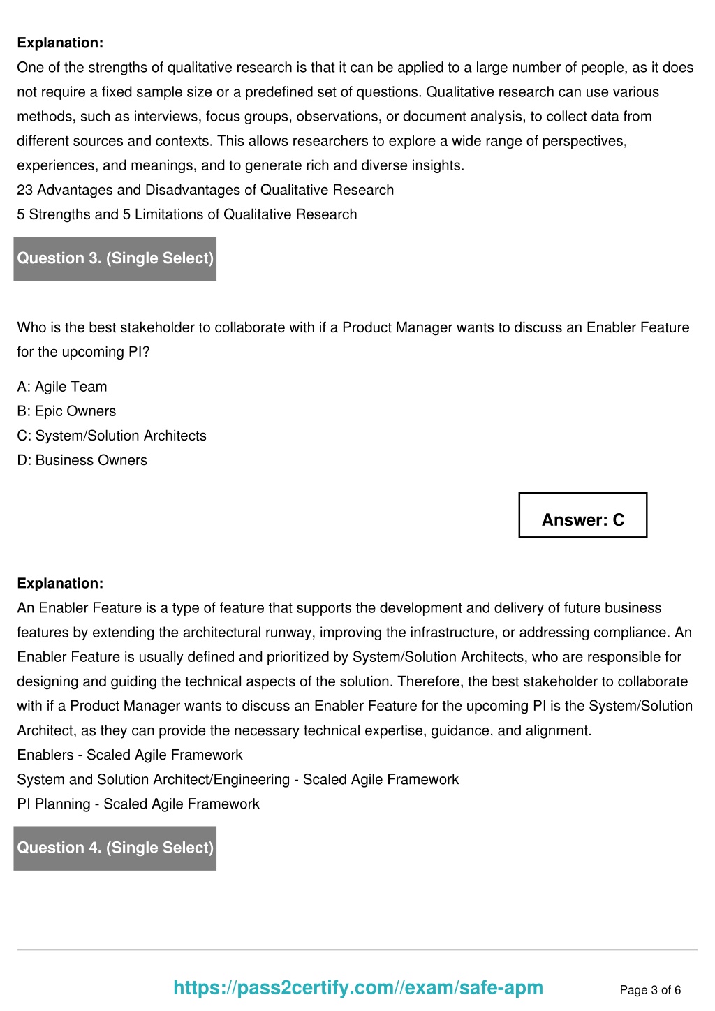 Explanation: One of the strengths of qualitative research is that it can be applied to a large number of people, as it does not require a fixed sample size or a predefined set of questions. Qualitative research can use various methods, such as interviews, focus groups, observations, or document analysis, to collect data from different sources and contexts. This allows researchers to explore a wide range of perspectives, experiences, and meanings, and to generate rich and diverse insights. 23 Advantages and Disadvantages of Qualitative Research 5 Strengths and 5 Limitations of Qualitative Research Question 3. (Single Select) Who is the best stakeholder to collaborate with if a Product Manager wants to discuss an Enabler Feature for the upcoming PI? A: Agile Team B: Epic Owners C: System/Solution Architects D: Business Owners Answer: C Explanation: An Enabler Feature is a type of feature that supports the development and delivery of future business features by extending the architectural runway, improving the infrastructure, or addressing compliance. An Enabler Feature is usually defined and prioritized by System/Solution Architects, who are responsible for designing and guiding the technical aspects of the solution. Therefore, the best stakeholder to collaborate with if a Product Manager wants to discuss an Enabler Feature for the upcoming PI is the System/Solution Architect, as they can provide the necessary technical expertise, guidance, and alignment. Enablers - Scaled Agile Framework System and Solution Architect/Engineering - Scaled Agile Framework PI Planning - Scaled Agile Framework Question 4. (Single Select) https://pass2certify.com//exam/safe-apm Page 3 of 6