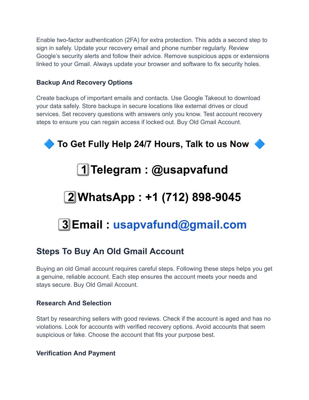 Enable two-factor authentication (2FA) for extra protection. This adds a second step to sign in safely. Update your recovery email and phone number regularly. Review Google’s security alerts and follow their advice. Remove suspicious apps or extensions linked to your Gmail. Always update your browser and software to fix security holes. Backup And Recovery Options Create backups of important emails and contacts. Use Google Takeout to download your data safely. Store backups in secure locations like external drives or cloud services. Set recovery questions with answers only you know. Test account recovery steps to ensure you can regain access if locked out. Buy Old Gmail Account. ? To Get Fully Help 24/7 Hours, Talk to us Now ? 1⃣ Telegram : @usapvafund 2⃣ WhatsApp : +1 (712) 898-9045 3⃣ Email : usapvafund@gmail.com Steps To Buy An Old Gmail Account Buying an old Gmail account requires careful steps. Following these steps helps you get a genuine, reliable account. Each step ensures the account meets your needs and stays secure. Buy Old Gmail Account. Research And Selection Start by researching sellers with good reviews. Check if the account is aged and has no violations. Look for accounts with verified recovery options. Avoid accounts that seem suspicious or fake. Choose the account that fits your purpose best. Verification And Payment