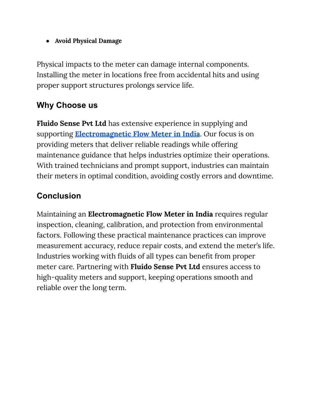 ● Avoid Physical Damage Physical impacts to the meter can damage internal components. Installing the meter in locations free from accidental hits and using proper support structures prolongs service life. Why Choose us Fluido Sense Pvt Ltd has extensive experience in supplying and supporting Electromagnetic Flow Meter in India. Our focus is on providing meters that deliver reliable readings while offering maintenance guidance that helps industries optimize their operations. With trained technicians and prompt support, industries can maintain their meters in optimal condition, avoiding costly errors and downtime. Conclusion Maintaining an Electromagnetic Flow Meter in India requires regular inspection, cleaning, calibration, and protection from environmental factors. Following these practical maintenance practices can improve measurement accuracy, reduce repair costs, and extend the meter’s life. Industries working with fluids of all types can benefit from proper meter care. Partnering with Fluido Sense Pvt Ltd ensures access to high-quality meters and support, keeping operations smooth and reliable over the long term.