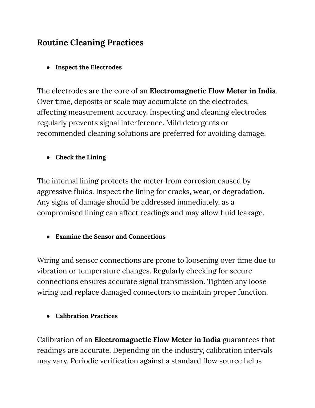 Routine Cleaning Practices ● Inspect the Electrodes The electrodes are the core of an Electromagnetic Flow Meter in India. Over time, deposits or scale may accumulate on the electrodes, affecting measurement accuracy. Inspecting and cleaning electrodes regularly prevents signal interference. Mild detergents or recommended cleaning solutions are preferred for avoiding damage. ● Check the Lining The internal lining protects the meter from corrosion caused by aggressive fluids. Inspect the lining for cracks, wear, or degradation. Any signs of damage should be addressed immediately, as a compromised lining can affect readings and may allow fluid leakage. ● Examine the Sensor and Connections Wiring and sensor connections are prone to loosening over time due to vibration or temperature changes. Regularly checking for secure connections ensures accurate signal transmission. Tighten any loose wiring and replace damaged connectors to maintain proper function. ● Calibration Practices Calibration of an Electromagnetic Flow Meter in India guarantees that readings are accurate. Depending on the industry, calibration intervals may vary. Periodic verification against a standard flow source helps