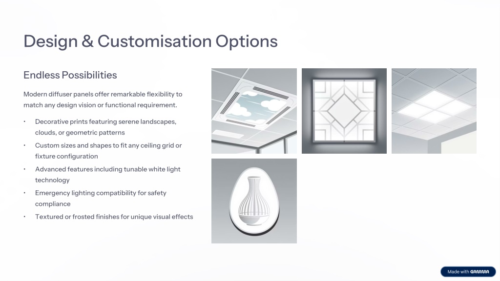 Design & Customisation Options Endless Possibilities Modern diffuser panels offer remarkable flexibility to match any design vision or functional requirement. • Decorative prints featuring serene landscapes, clouds, or geometric patterns • Custom sizes and shapes to fit any ceiling grid or fixture configuration • Advanced features including tunable white light technology • Emergency lighting compatibility for safety compliance • Textured or frosted finishes for unique visual effects