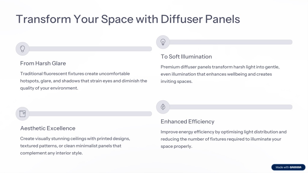 Transform Your Space with Diffuser Panels To Soft Illumination From Harsh Glare Premium diffuser panels transform harsh light into gentle, even illumination that enhances wellbeing and creates inviting spaces. Traditional fluorescent fixtures create uncomfortable hotspots, glare, and shadows that strain eyes and diminish the quality of your environment. Enhanced Efficiency Aesthetic Excellence Improve energy efficiency by optimising light distribution and reducing the number of fixtures required to illuminate your space properly. Create visually stunning ceilings with printed designs, textured patterns, or clean minimalist panels that complement any interior style.