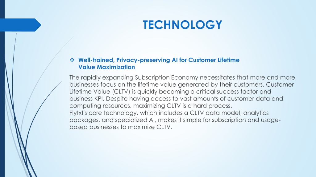 TECHNOLOGY • Well-trained, Privacy-preserving AI for Customer Lifetime Value Maximization The rapidly expanding Subscription Economy necessitates that more and more businesses focus on the lifetime value generated by their customers. Customer Lifetime Value (CLTV) is quickly becoming a critical success factor and business KPI. Despite having access to vast amounts of customer data and computing resources, maximizing CLTV is a hard process.Flytxt's core technology, which includes a CLTV data model, analytics packages, and specialized AI, makes it simple for subscription and usage-based businesses to maximize CLTV.