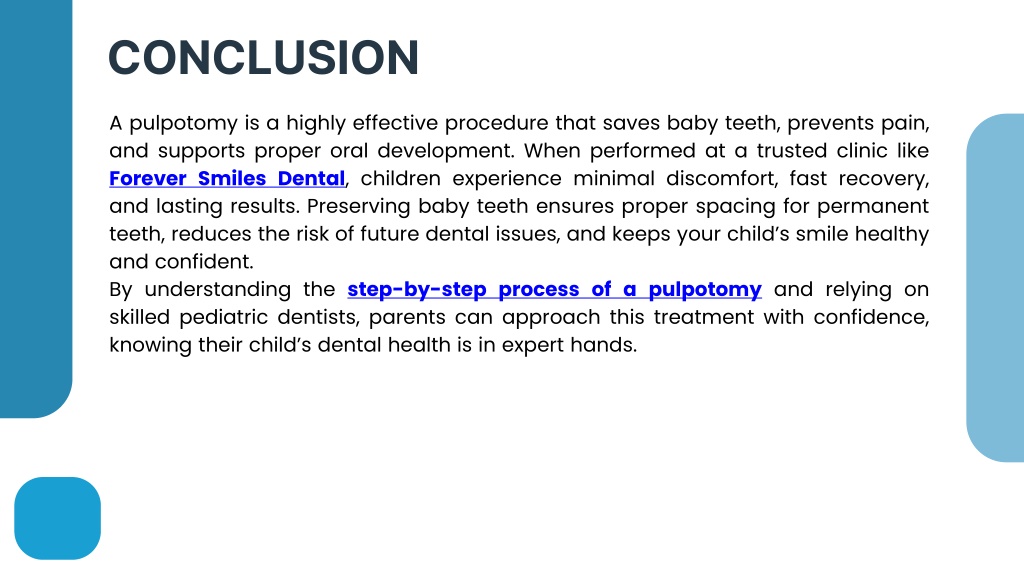 CONCLUSION A pulpotomy is a highly effective procedure that saves baby teeth, prevents pain, and supports proper oral development. When performed at a trusted clinic like Forever Smiles Dental, children experience minimal discomfort, fast recovery, and lasting results. Preserving baby teeth ensures proper spacing for permanent teeth, reduces the risk of future dental issues, and keeps your child’s smile healthy and confident. By understanding the step-by-step process of a pulpotomy and relying on skilled pediatric dentists, parents can approach this treatment with confidence, knowing their child’s dental health is in expert hands.