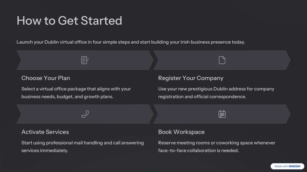 9. How to Get Started Launch your Dublin virtual office in four simple steps and start building your Irish business presence today. Choose Your Plan Register Your Company Select a virtual office package that aligns with your business needs, budget, and growth plans. Use your new prestigious Dublin address for company registration and official correspondence. Activate Services Book Workspace Start using professional mail handling and call answering services immediately. Reserve meeting rooms or coworking space whenever face-to-face collaboration is needed.