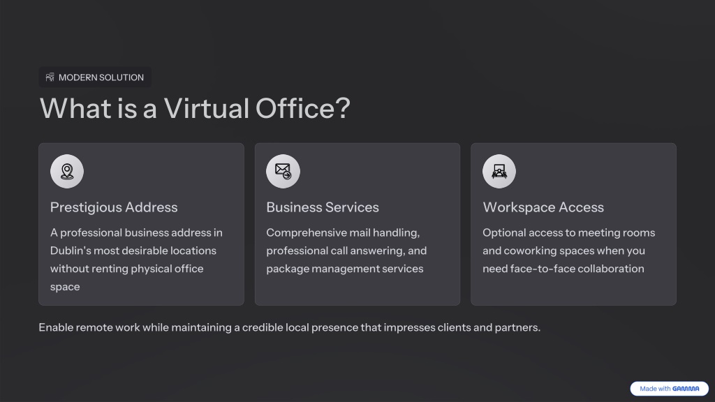 2. MODERN SOLUTION What is a Virtual Office? Prestigious Address Business Services Workspace Access A professional business address in Dublin's most desirable locations without renting physical office space Comprehensive mail handling, professional call answering, and package management services Optional access to meeting rooms and coworking spaces when you need face-to-face collaboration Enable remote work while maintaining a credible local presence that impresses clients and partners.