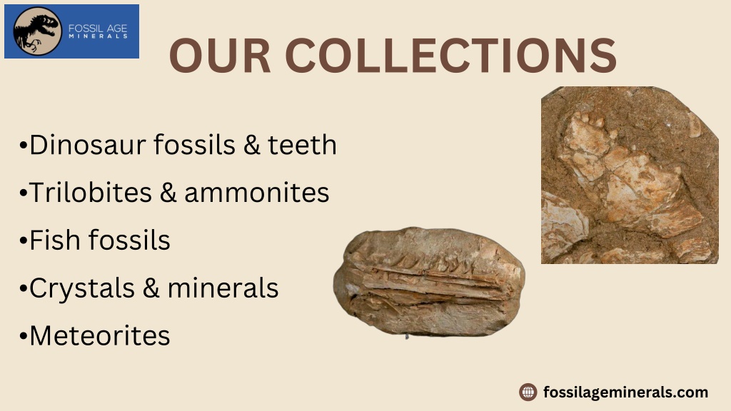 fossilageminerals.com OUR COLLECTIONS •Dinosaur fossils & teeth •Trilobites & ammonites •Fish fossils •Crystals & minerals •Meteorites