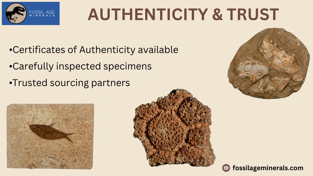 fossilageminerals.com AUTHENTICITY & TRUST •Certificates of Authenticity available •Carefully inspected specimens •Trusted sourcing partners