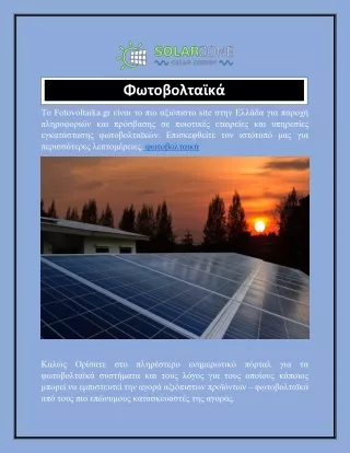 Φωτοβολταϊκά Το Fotovoltaika.gr είναι το πιο αξιόπιστο site στην Ελλάδα για παροχή πληροφοριών και πρόσβασης σε ποιοτικές εταιρείες και υπηρεσίες εγκατάστασης φωτοβολταϊκών. Επισκεφθείτε τον ιστότοπό μας για περισσότερες λεπτομέρειες.φωτοβολταικά Καλώς Ορίσατε στο πληρέστερο ενημερωτικό πόρταλ για τα φωτοβολταϊκά συστήματα και τους λόγος για τους οποίους κάποιος μπορεί να εμπιστευτεί την αγορά αξιόπιστων προϊόντων –φωτοβολταϊκά από τους πιο επώνυμους κατασκευαστές της αγοράς.