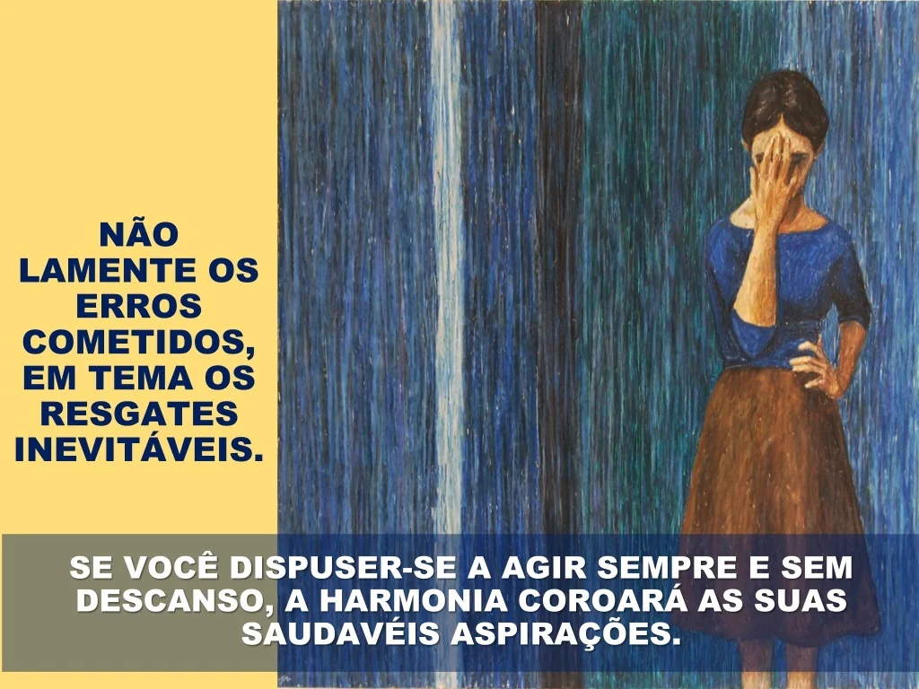 NÃO LAMENTE OS ERROS COMETIDOS, EM TEMA OS RESGATES INEVITÁVEIS. SE VOCÊ DISPUSER-SE A AGIR SEMPRE E SEM DESCANSO, A HARMONIA COROARÁ AS SUAS SAUDAVÉIS ASPIRAÇÕES.
