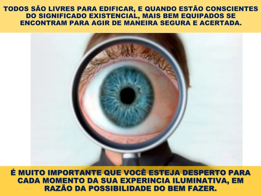 TODOS SÃO LIVRES PARA EDIFICAR, E QUANDO ESTÃO CONSCIENTES DO SIGNIFICADO EXISTENCIAL, MAIS BEM EQUIPADOS SE ENCONTRAM PARA AGIR DE MANEIRA SEGURA E ACERTADA. É MUITO IMPORTANTE QUE VOCÊ ESTEJA DESPERTO PARA CADA MOMENTO DA SUA EXPERINCIA ILUMINATIVA, EM RAZÃO DA POSSIBILIDADE DO BEM FAZER.