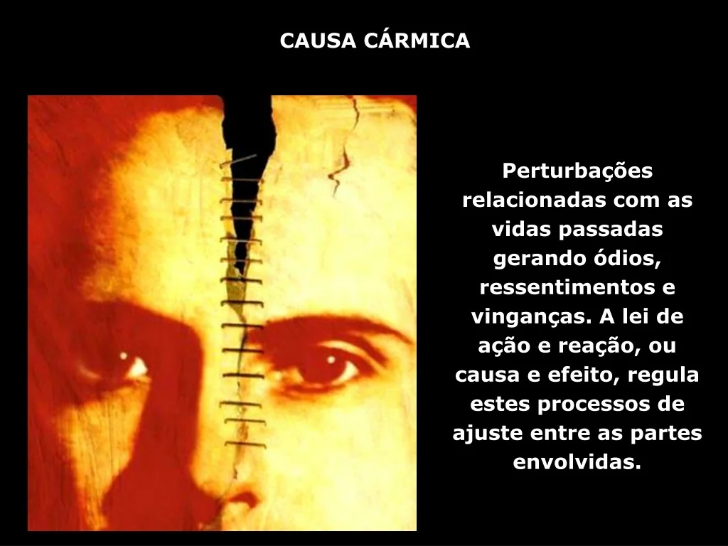 CAUSA CÁRMICA Perturbações relacionadas com as vidas passadas gerando ódios, ressentimentos e vinganças. A lei de ação e reação, ou causa e efeito, regula estes processos de ajuste entre as partes envolvidas. 20
