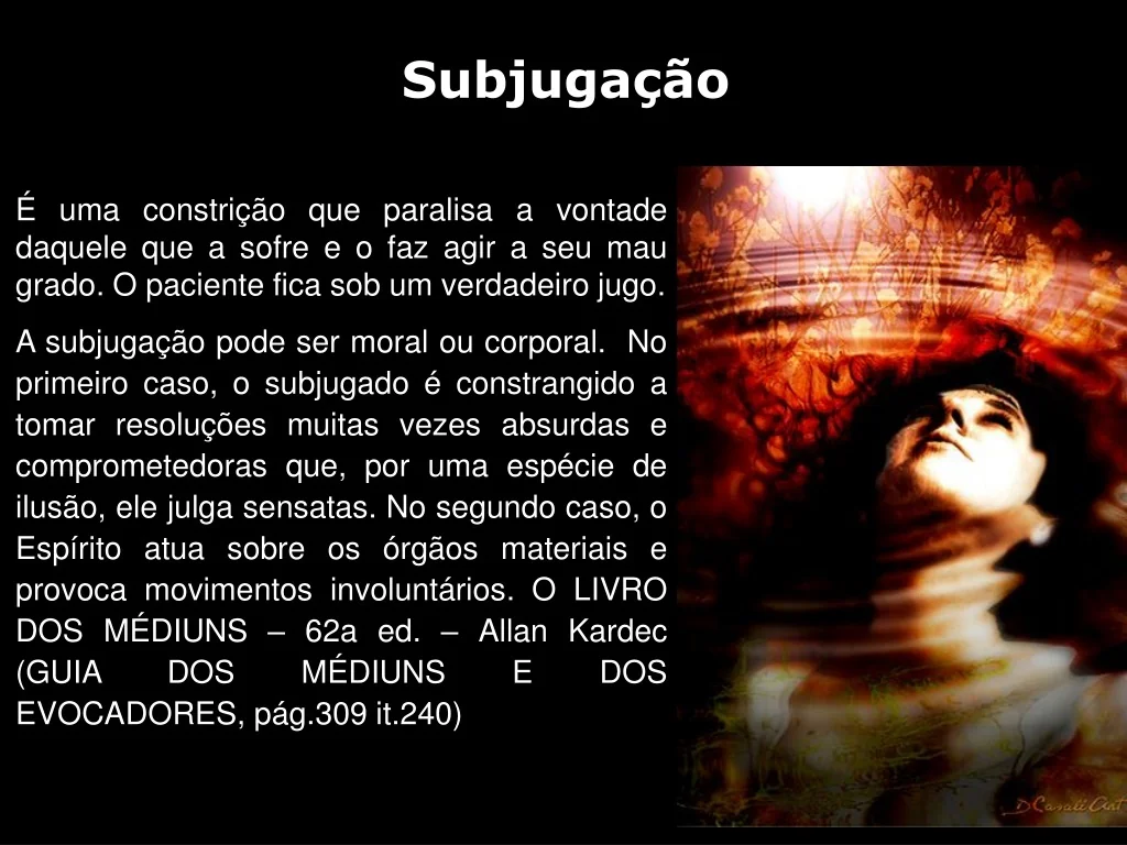 Subjugação É uma constrição que paralisa a vontade daquele que a sofre e o faz agir a seu mau grado. O paciente fica sob um verdadeiro jugo. A subjugação pode ser moral ou corporal. No primeiro caso, o subjugado é constrangido a tomar resoluções muitas vezes absurdas e comprometedoras que, por uma espécie de ilusão, ele julga sensatas. No segundo caso, o Espírito atua sobre os órgãos materiais e provoca movimentos involuntários. O LIVRO DOS MÉDIUNS – 62a ed. – Allan Kardec (GUIA DOS MÉDIUNS EVOCADORES, pág.309 it.240) E DOS 33