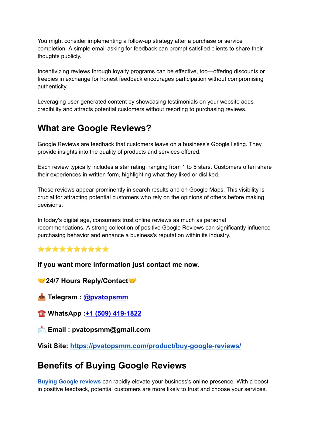 3. You might consider implementing a follow-up strategy after a purchase or service completion. A simple email asking for feedback can prompt satisfied clients to share their thoughts publicly. Incentivizing reviews through loyalty programs can be effective, too—offering discounts or freebies in exchange for honest feedback encourages participation without compromising authenticity. Leveraging user-generated content by showcasing testimonials on your website adds credibility and attracts potential customers without resorting to purchasing reviews. What are Google Reviews? Google Reviews are feedback that customers leave on a business's Google listing. They provide insights into the quality of products and services offered. Each review typically includes a star rating, ranging from 1 to 5 stars. Customers often share their experiences in written form, highlighting what they liked or disliked. These reviews appear prominently in search results and on Google Maps. This visibility is crucial for attracting potential customers who rely on the opinions of others before making decisions. In today's digital age, consumers trust online reviews as much as personal recommendations. A strong collection of positive Google Reviews can significantly influence purchasing behavior and enhance a business's reputation within its industry. ⭐⭐⭐⭐⭐⭐⭐⭐⭐⭐ If you want more information just contact me now. ?24/7 Hours Reply/Contact? ? Telegram : @pvatopsmm ☎ WhatsApp :+1 (509) 419-1822 ? Email : pvatopsmm@gmail.com Visit Site: https://pvatopsmm.com/product/buy-google-reviews/ Benefits of Buying Google Reviews Buying Google reviews can rapidly elevate your business's online presence. With a boost in positive feedback, potential customers are more likely to trust and choose your services.