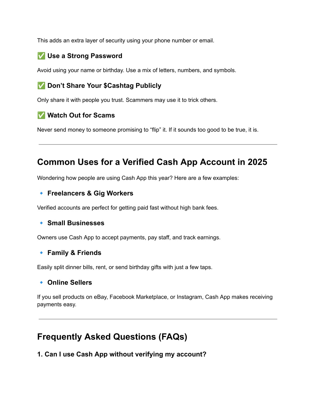 This adds an extra layer of security using your phone number or email. ✅ Use a Strong Password Avoid using your name or birthday. Use a mix of letters, numbers, and symbols. ✅ Don’t Share Your $Cashtag Publicly Only share it with people you trust. Scammers may use it to trick others. ✅ Watch Out for Scams Never send money to someone promising to “flip” it. If it sounds too good to be true, it is. Common Uses for a Verified Cash App Account in 2025 Wondering how people are using Cash App this year? Here are a few examples: ? Freelancers & Gig Workers Verified accounts are perfect for getting paid fast without high bank fees. ? Small Businesses Owners use Cash App to accept payments, pay staff, and track earnings. ? Family & Friends Easily split dinner bills, rent, or send birthday gifts with just a few taps. ? Online Sellers If you sell products on eBay, Facebook Marketplace, or Instagram, Cash App makes receiving payments easy. Frequently Asked Questions (FAQs) 1. Can I use Cash App without verifying my account?