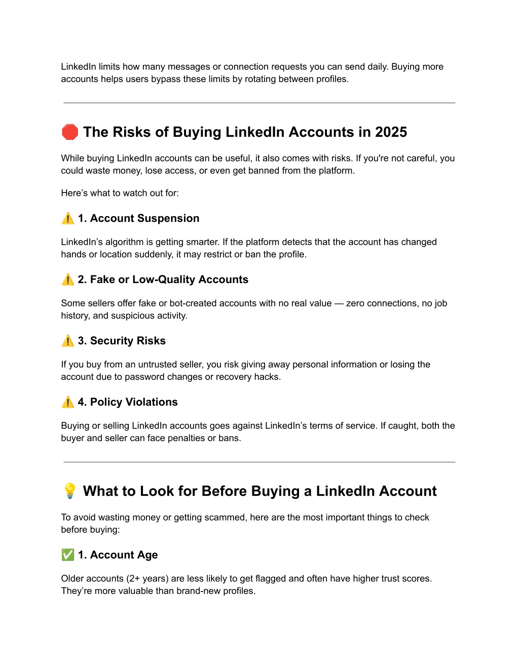 LinkedIn limits how many messages or connection requests you can send daily. Buying more accounts helps users bypass these limits by rotating between profiles. ? The Risks of Buying LinkedIn Accounts in 2025 While buying LinkedIn accounts can be useful, it also comes with risks. If you're not careful, you could waste money, lose access, or even get banned from the platform. Here’s what to watch out for: ⚠ 1. Account Suspension LinkedIn’s algorithm is getting smarter. If the platform detects that the account has changed hands or location suddenly, it may restrict or ban the profile. ⚠ 2. Fake or Low-Quality Accounts Some sellers offer fake or bot-created accounts with no real value — zero connections, no job history, and suspicious activity. ⚠ 3. Security Risks If you buy from an untrusted seller, you risk giving away personal information or losing the account due to password changes or recovery hacks. ⚠ 4. Policy Violations Buying or selling LinkedIn accounts goes against LinkedIn’s terms of service. If caught, both the buyer and seller can face penalties or bans. ? What to Look for Before Buying a LinkedIn Account To avoid wasting money or getting scammed, here are the most important things to check before buying: ✅ 1. Account Age Older accounts (2+ years) are less likely to get flagged and often have higher trust scores. They’re more valuable than brand-new profiles.