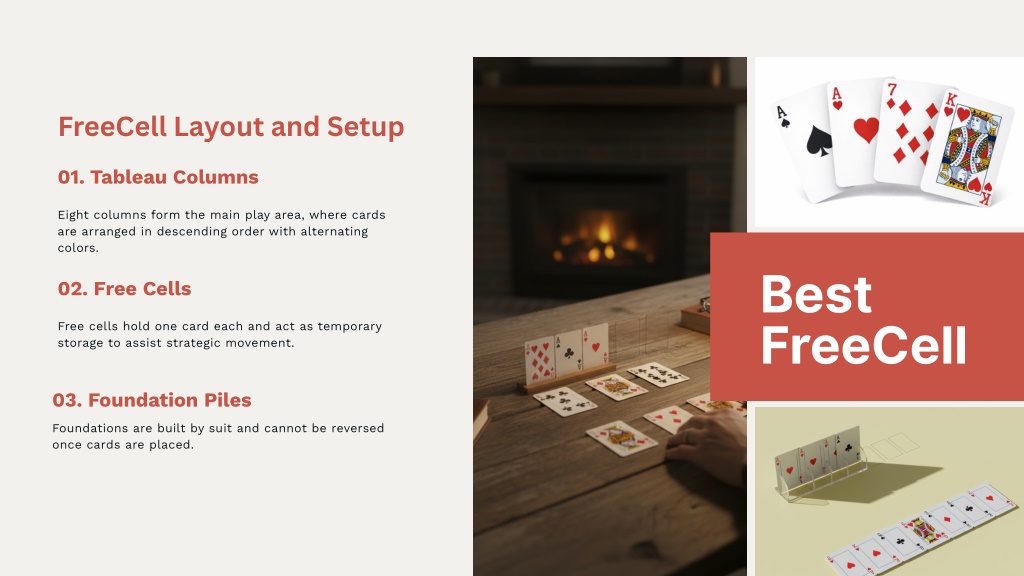 4. FreeCell Layout and Setup 01. Tableau Columns Eight columns form the main play area, where cards are arranged in descending order with alternating colors. Best FreeCell 02. Free Cells Free cells hold one card each and act as temporary storage to assist strategic movement. 03. Foundation Piles Foundations are built by suit and cannot be reversed once cards are placed.
