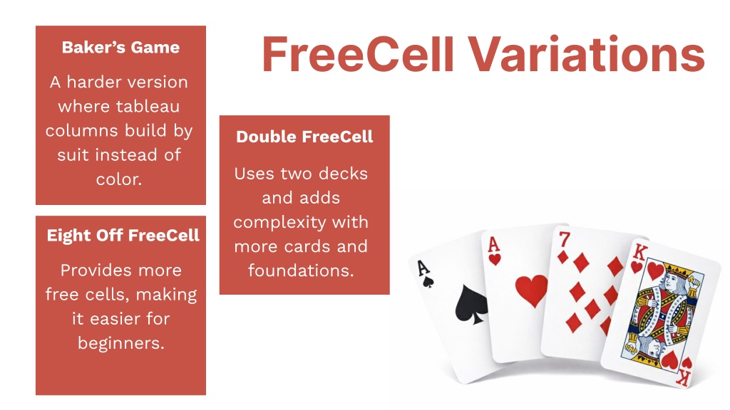 8. FreeCell Variations Baker’s Game A harder version where tableau columns build by suit instead of color. Double FreeCell Uses two decks and adds complexity with more cards and foundations. Eight Off FreeCell Provides more free cells, making it easier for beginners.